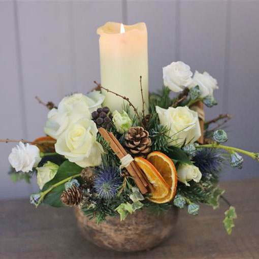 Lovely table centre set in a rustic ceramic pot. Features white seasonal flowers, festive foliages, decorations and a chunky church candle.