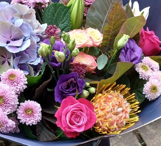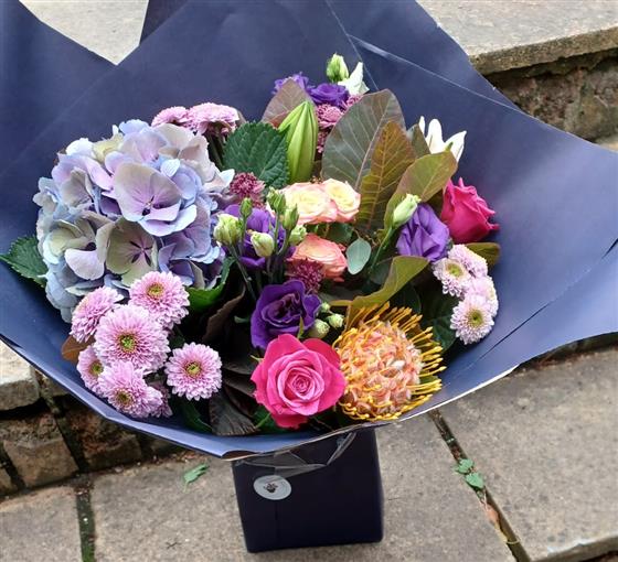This pretty hand tied bouquet combines pinks, blues and purples seasonal flowers to create a country style display.