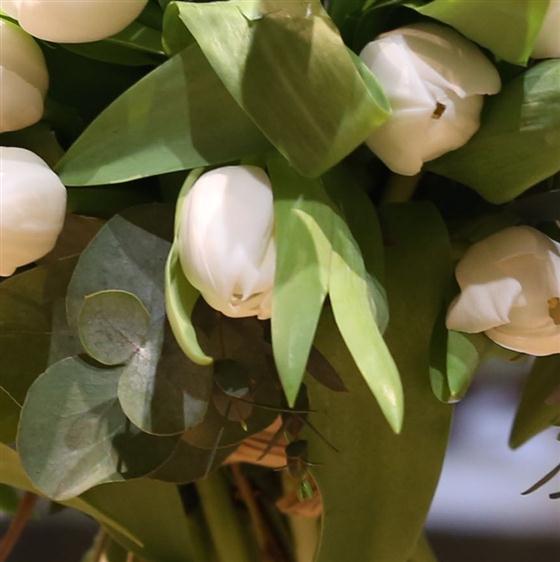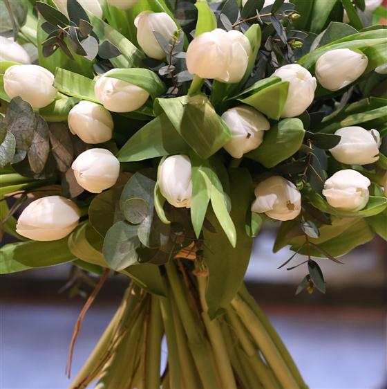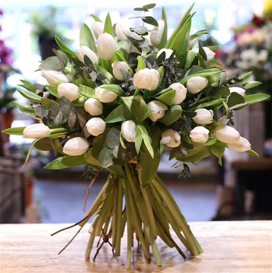 A simple and stylish hand tied posy of all white tulips and eucalyptus presented in water.